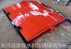 生產鑄鐵鑲銅閘門,鑄鐵鑲銅方閘門由門框、閘板、導軌、密封條、傳動螺桿、吊塊螺母/吊耳和可調整密封機構等部件組成,其中門框和閘板均由優質灰口鑄鐵或球墨鑄鐵制成,導軌左右對稱布置且用不銹鋼螺栓定位銷與門框二側端部連接 (對中小口徑的閘門,其導軌可與門框澆注成一體),導軌長度一般為閘門全開啟高度的1/2~1/3,因而整體結構強度高、剛性高、耐磨、耐腐蝕性好、承壓能力大。